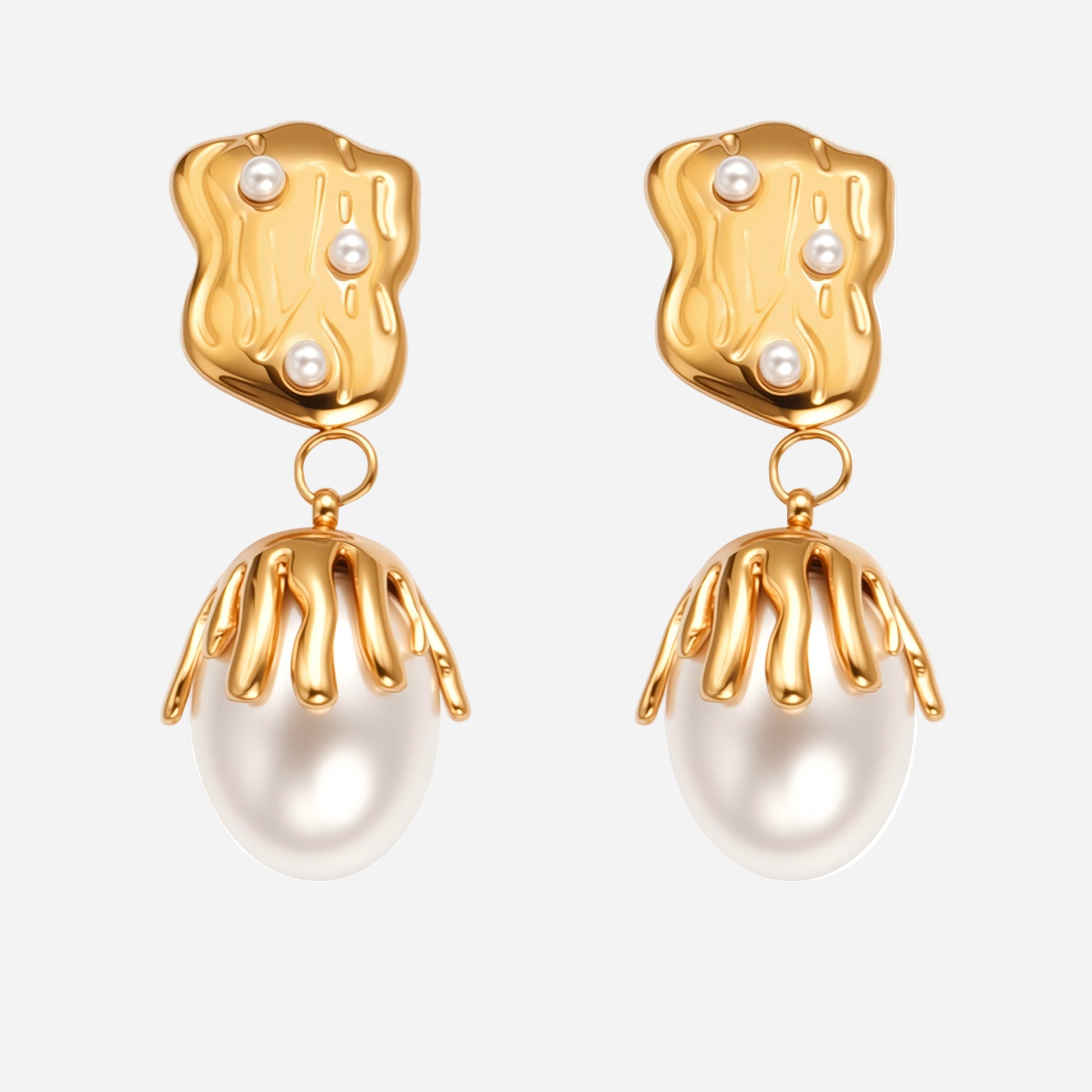 18k Real Gold Shaped Baroque Imitation Pearl Pendant Earrings