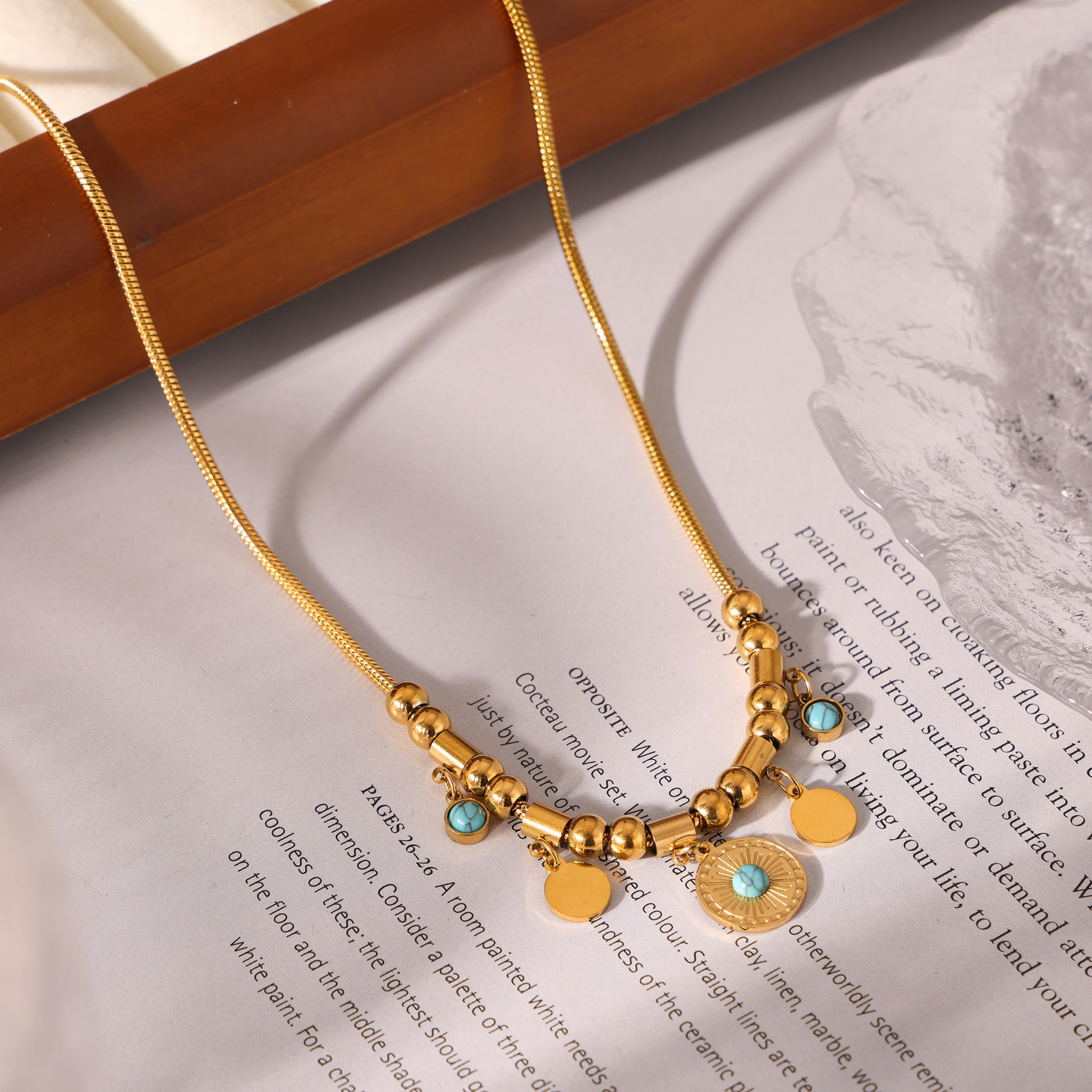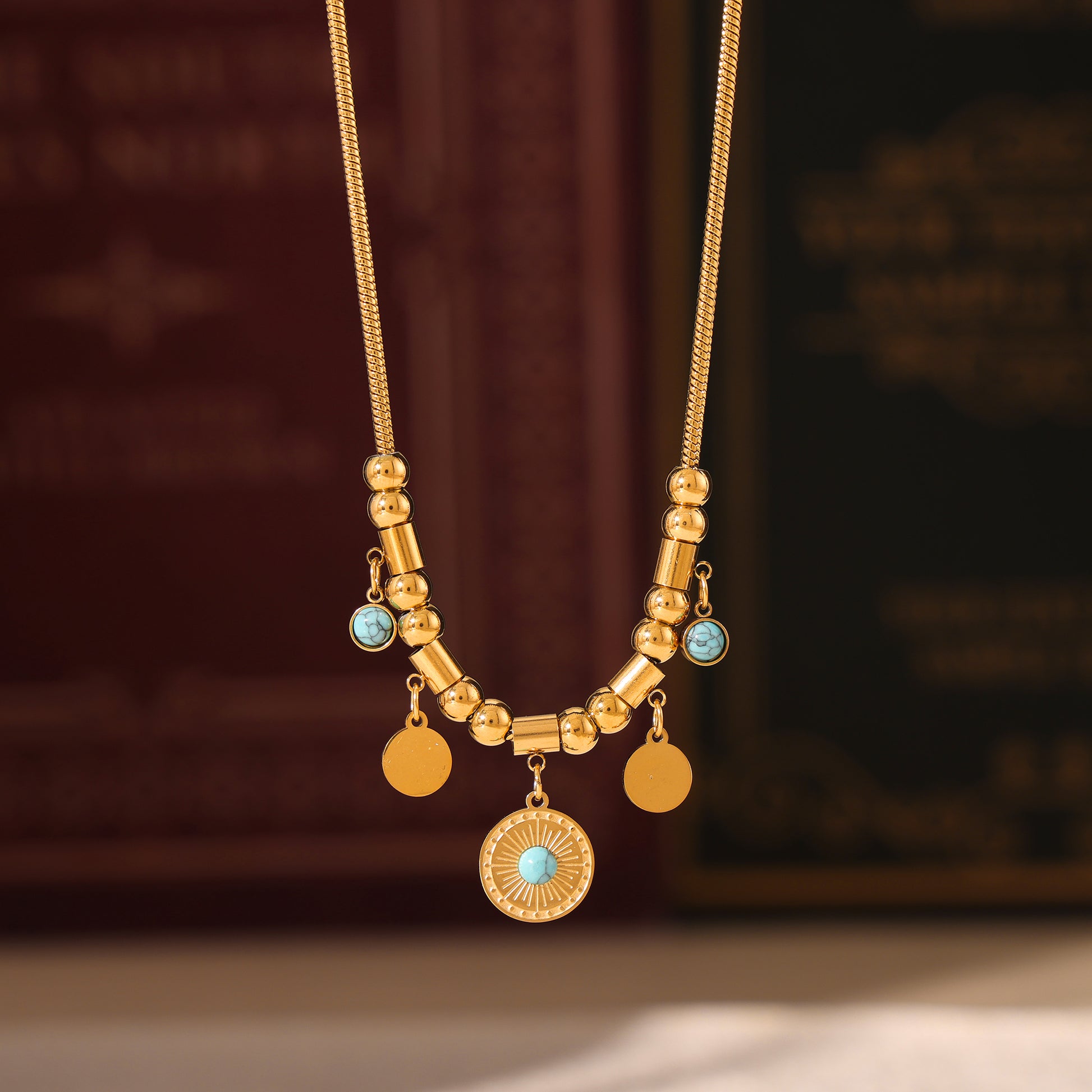 Introducing our Blue Turquoise Round Pendan Necklace - the perfect waterproof & tarnish-free summer necklace that will add a pop of color to any outfit.