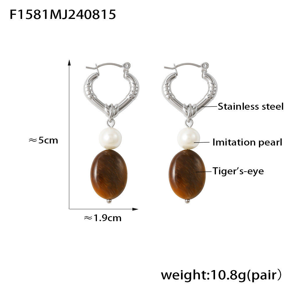 Heart Tassel Imitation Pearl Tiger Eye Stone Earrings Stainless Steel