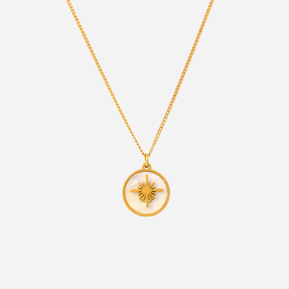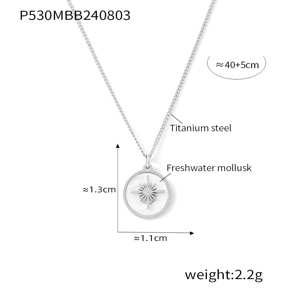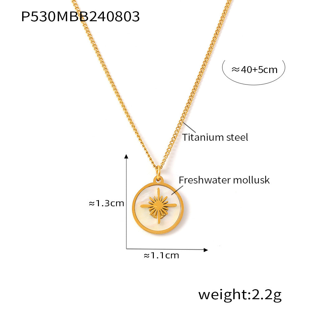 Crafted from high-quality titanium steel and adorned with beautiful shell elements, the necklace undergoes a meticulous electroplating process to achieve a radiant 18K gold or sleek steel finish. The geometric design of the pendant adds a touch of sophistication and edge, making it a standout accessory for any occasion.