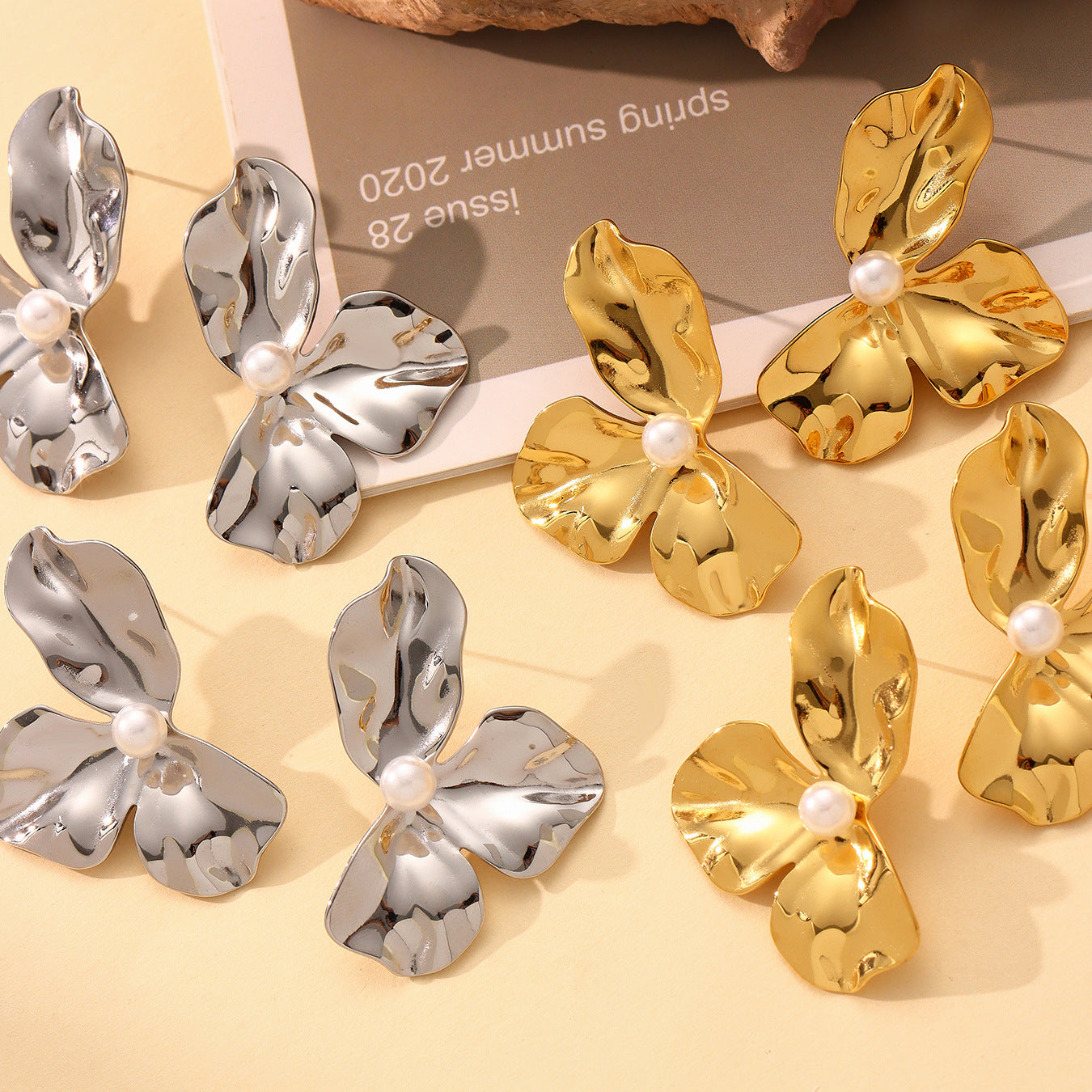 Shell Pearl Folded Petals Stainless Steel Stud Earrings