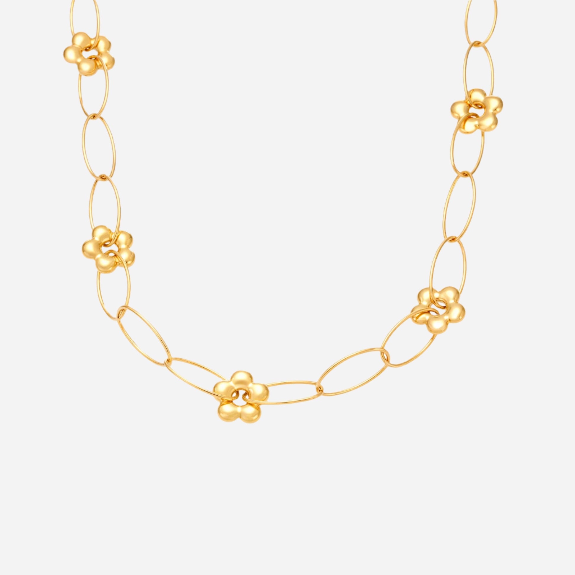 Introducing our Stainless Steel Gold Flower Design Handmade Chain Necklace - the perfect waterproof & tarnish-free summer necklace that will add a pop of color to any outfit.