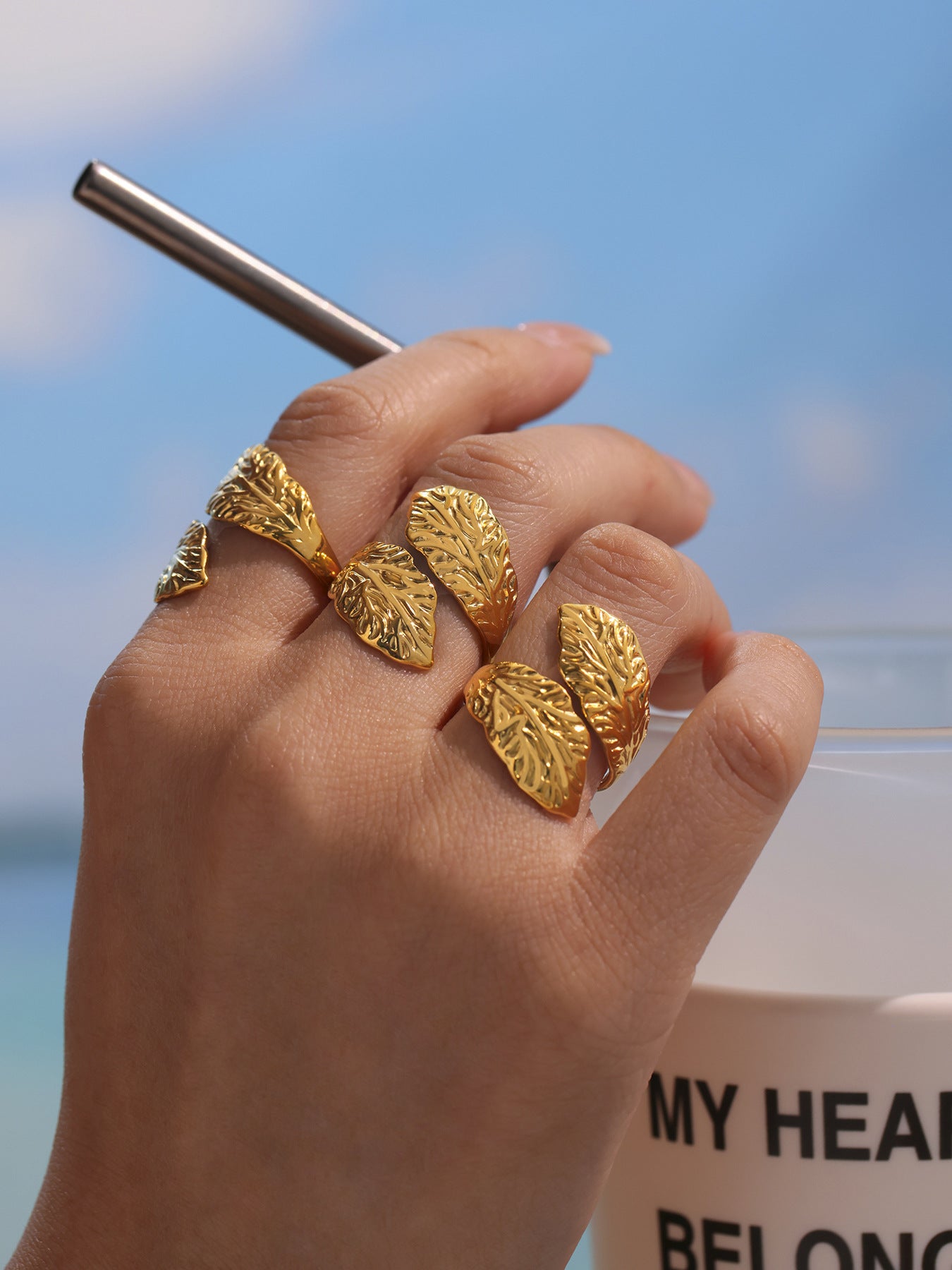 Introducing our Stainless Steel Leaf Texture Open Ring Women - the perfect waterproof & tarnish-free summer necklace that will add a pop of color to any outfit.