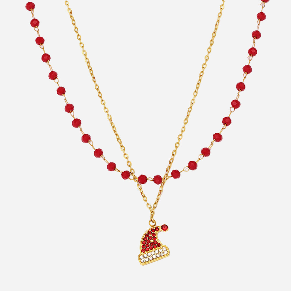 Introducing our Stainless Steel Zircon Christmas Hat Pendant Garnet Double Bracelet - the perfect waterproof & tarnish-free summer necklace that will add a pop of color to any outfit.
