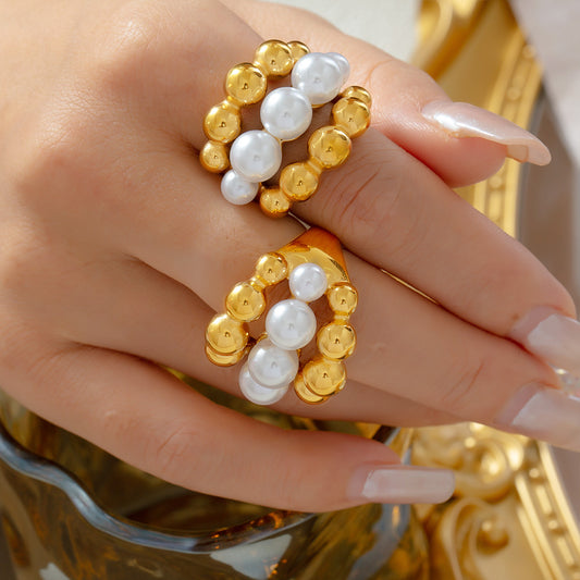 Adjustable Multi-Layer Pearl Ring – Gold-Plated Stacked Look