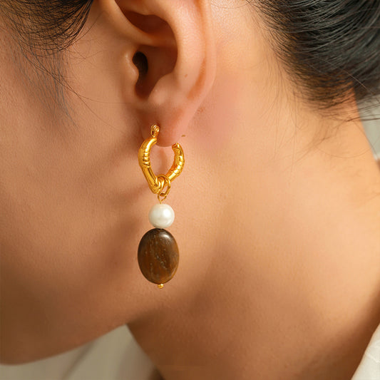 Heart Tassel Imitation Pearl Tiger Eye Stone Earrings Stainless Steel