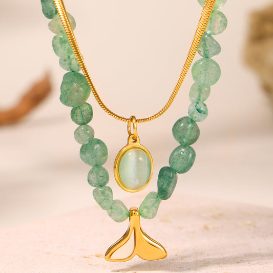 Green Stone Fish Tail Pendant Necklace | Double Layer Shell Snake Chain Jewelry