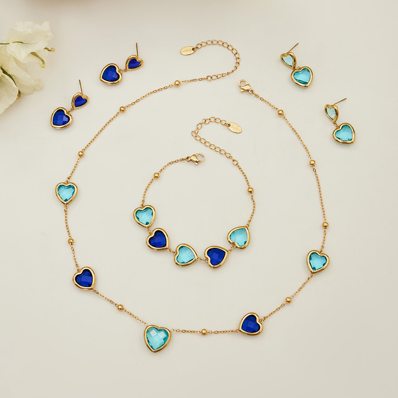 Inspired by the calming beauty of sea glass, these five heart bracelet set in polished 18K gold-plated stainless steel. Lightweight, vibrant, and hypoallergenic and tarnished resistant they bring a refreshing pop of colour to any outfit.