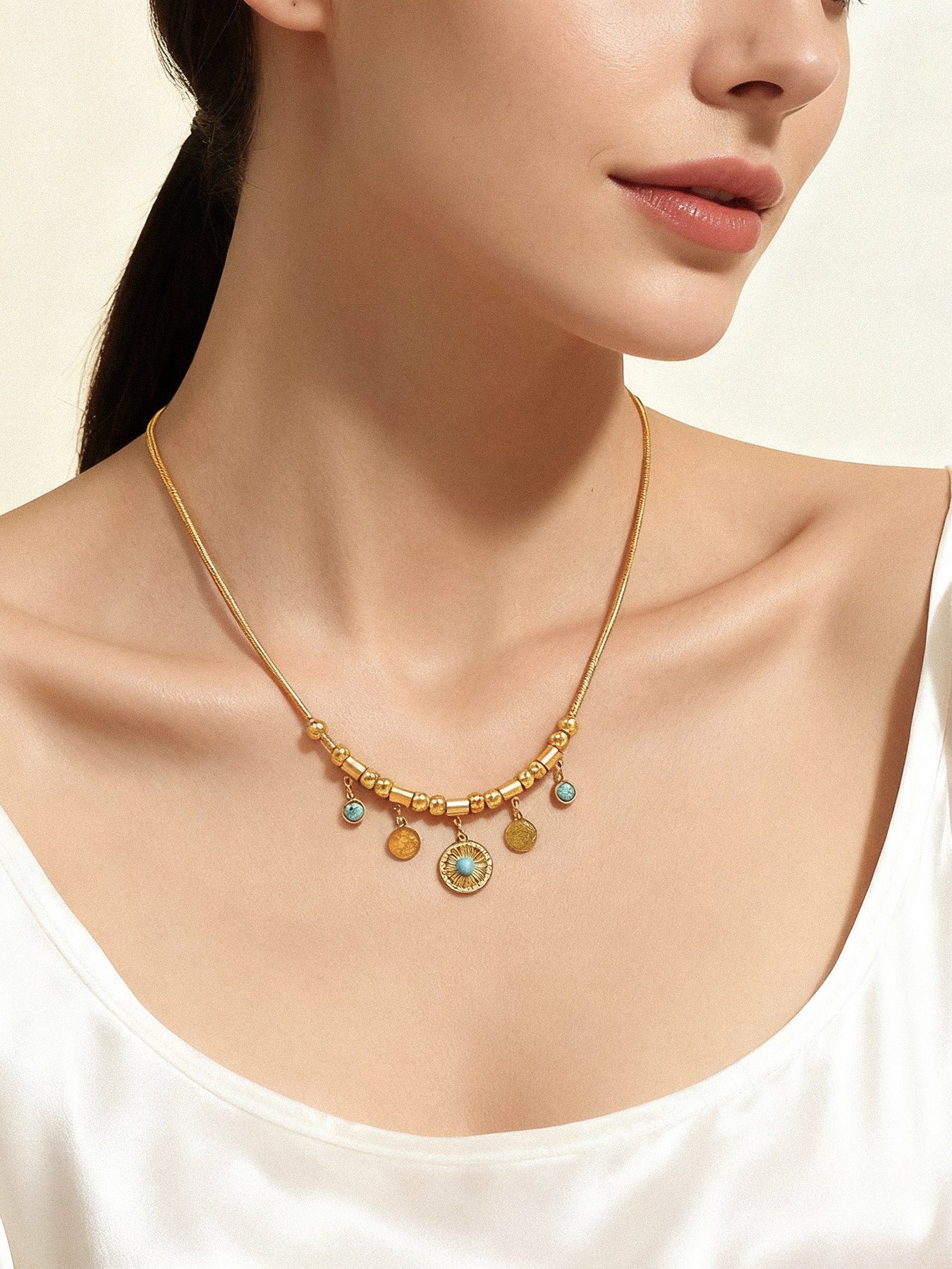 Presentamos nuestro collar colgante redondo de turquesa azul: el collar de verano perfecto, resistente al agua y al deslustre, que agregará un toque de color a cualquier atuendo.