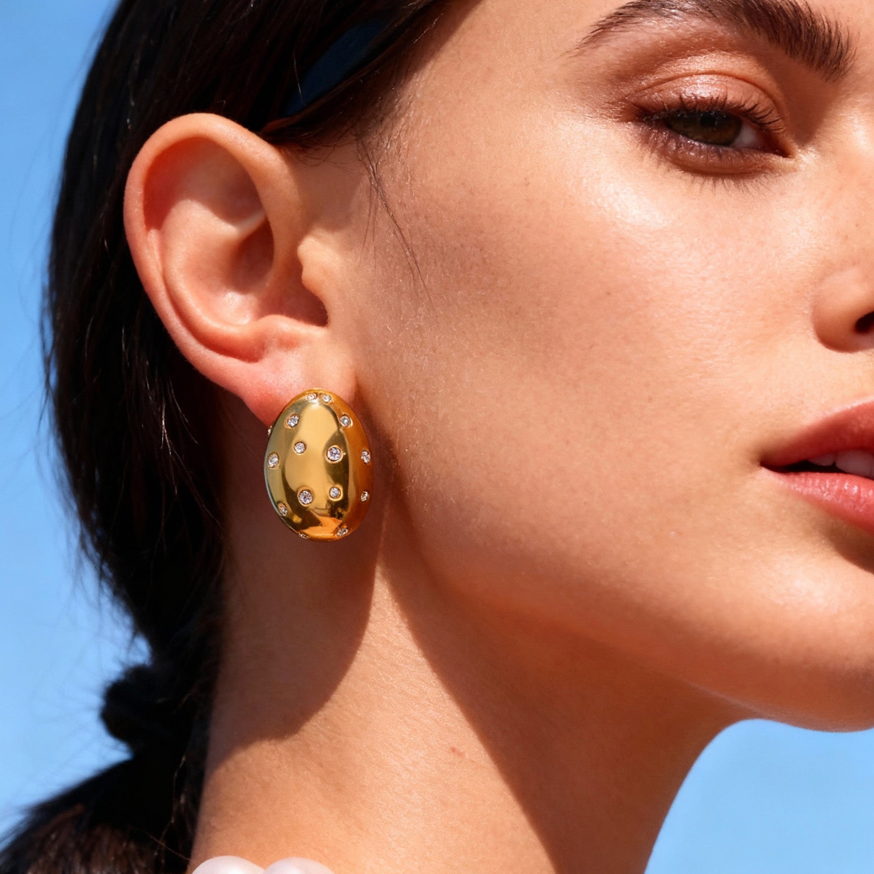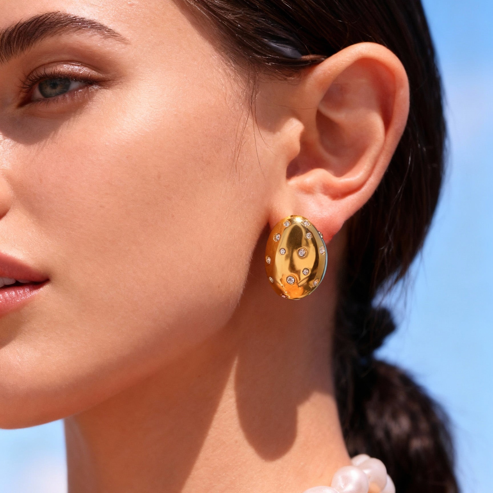 Presentamos nuestros aretes ovalados con diamantes de imitación: el collar de verano perfecto, resistente al agua y al deslustre, que agregará un toque de color a cualquier atuendo.
