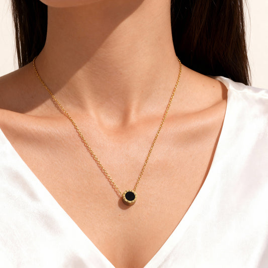 Collar de acero inoxidable con números romanos de acrílico negro y concha marina blanca