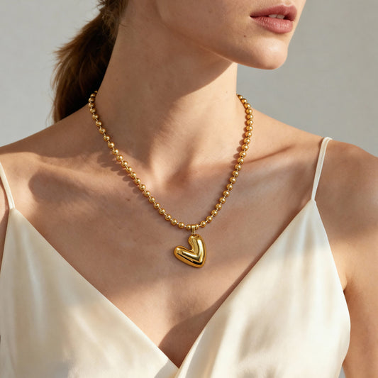 Collar de cuentas redondas con colgante de corazón de acero inoxidable
