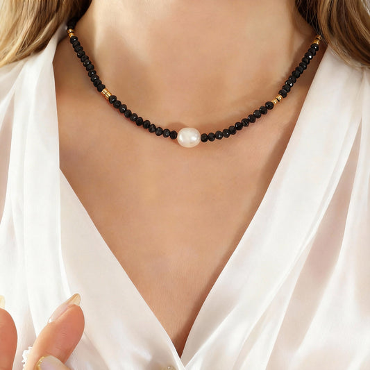 Cadena de cuentas negras con perla de agua dulce | Joyería minimalista y audaz