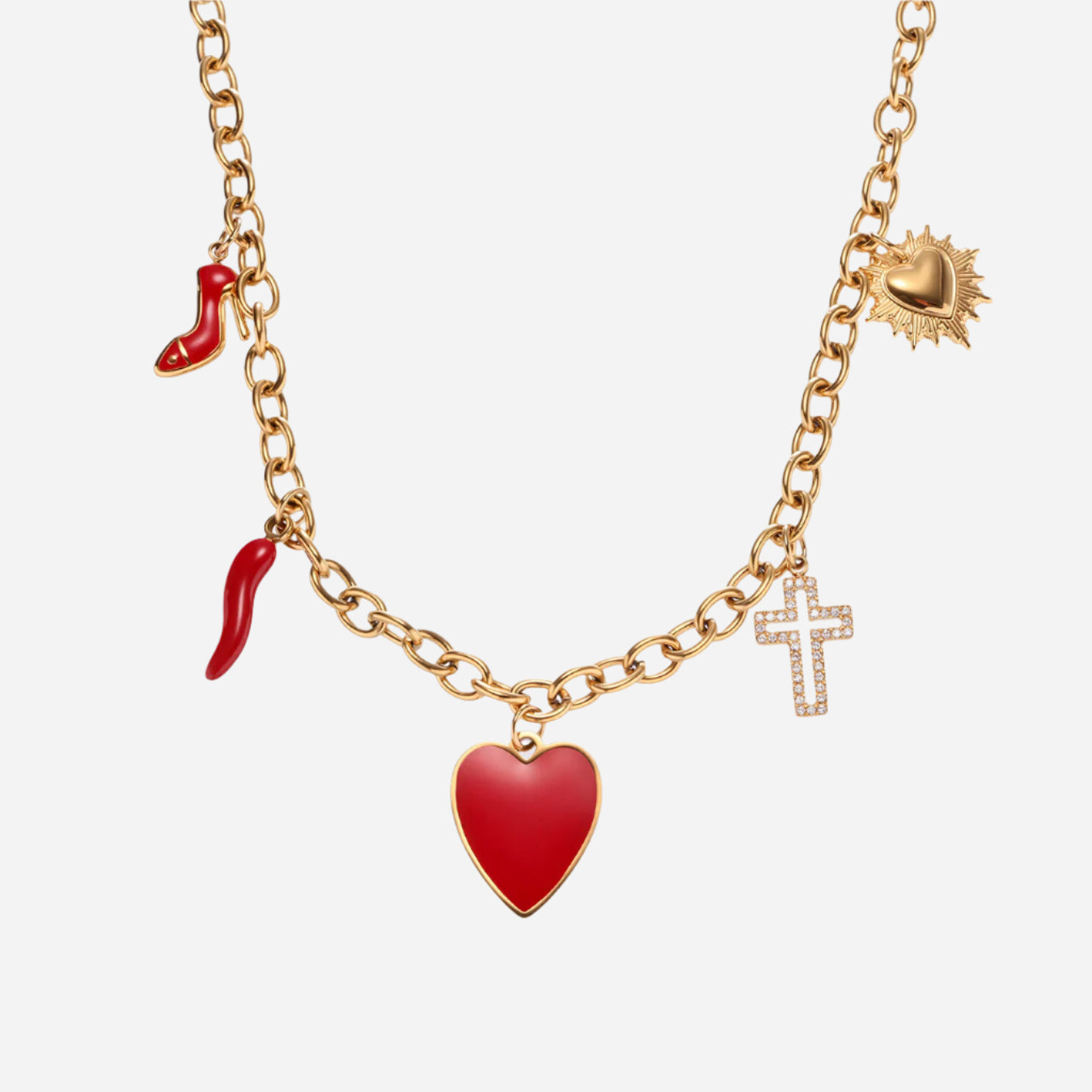 - Distinctive drip oil cross design with multi-charms including love and high heels