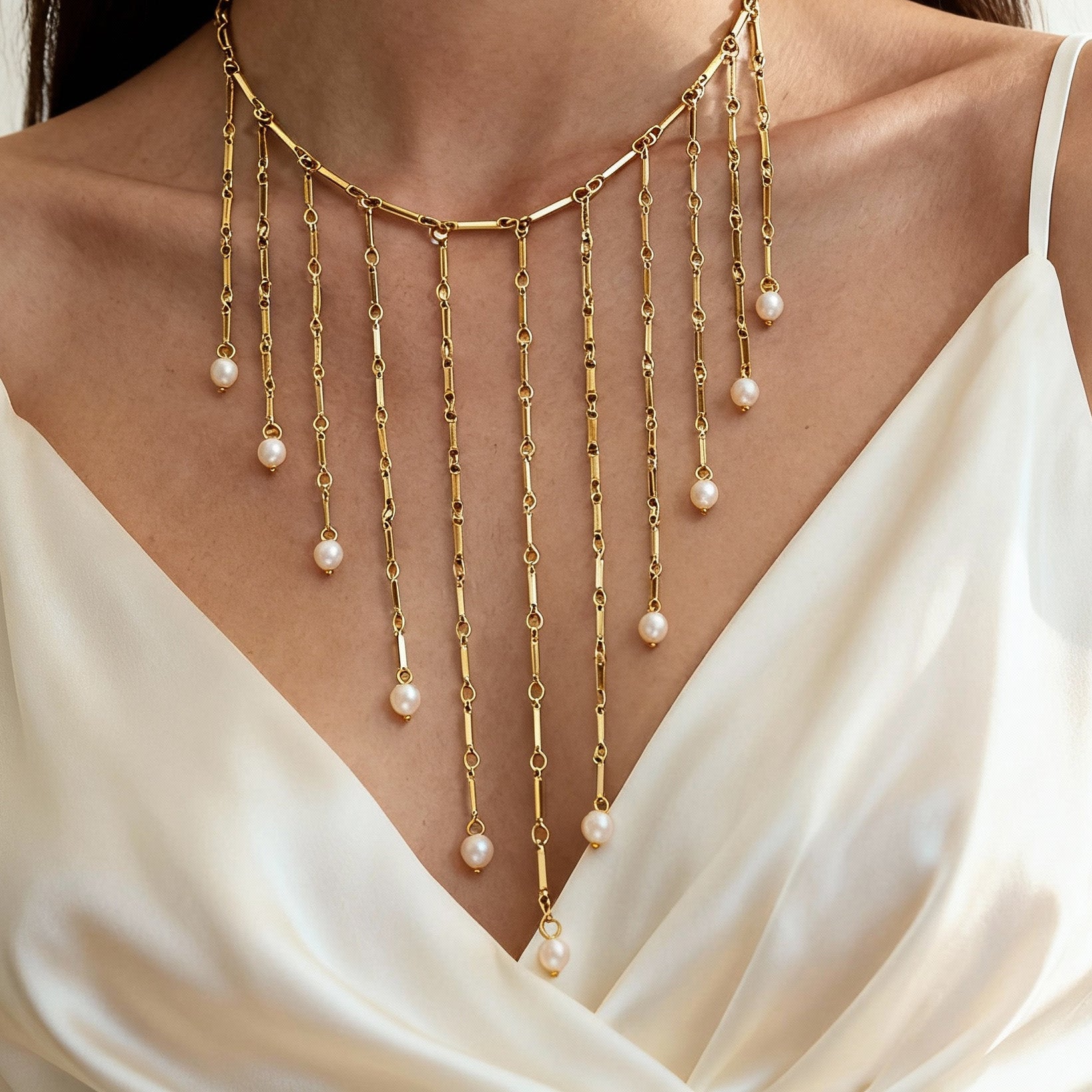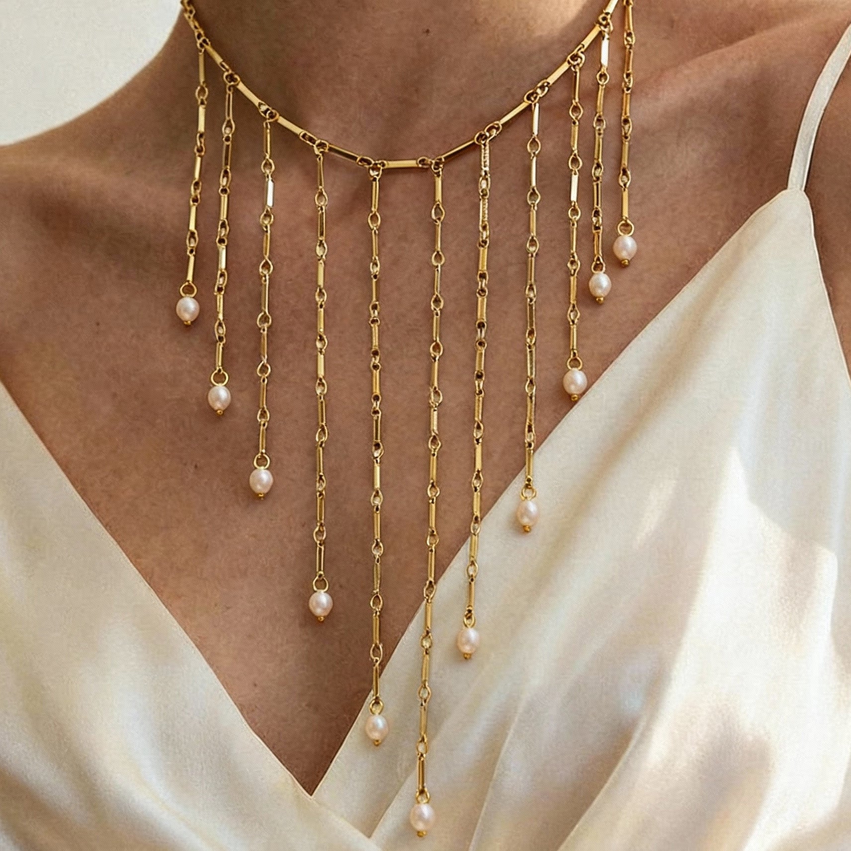 隆重推出我们的淡水珍珠多流苏锁骨项链(不锈钢材质)——完美的防水防褪色夏季项链,可为任何装扮增添一抹亮丽色彩。